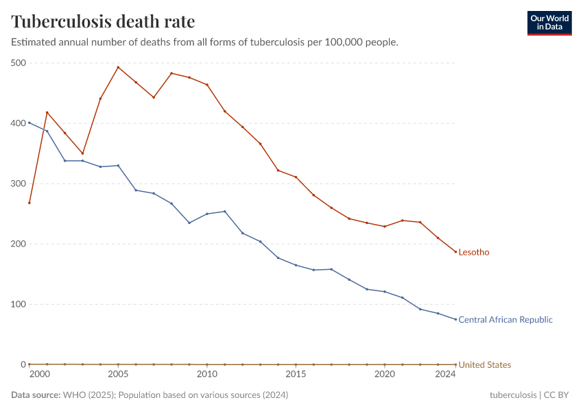 WHO (2024); Population based on various sources (2024) – with minor processing by Our World in Data. “Tuberculosis death rate” [dataset]. WHO, “Global Tuberculosis Report - Burden Estimates”; Various sources, “Population” [original data]. Retrieved June 26, 2025 from https://remove-datapage-tags.owid.pages.dev/grapher/tuberculosis-death-rate