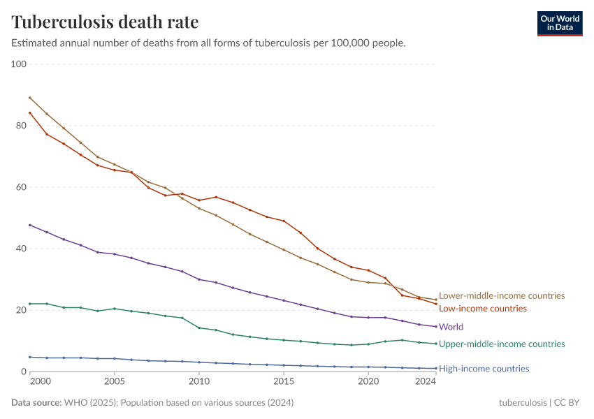 WHO (2024); Population based on various sources (2024) – with minor processing by Our World in Data. “Tuberculosis death rate” [dataset]. WHO, “Global Tuberculosis Report - Burden Estimates”; Various sources, “Population” [original data]. Retrieved June 26, 2025 from https://remove-datapage-tags.owid.pages.dev/grapher/tuberculosis-death-rate