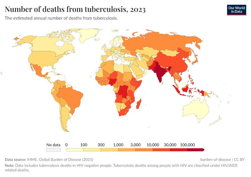 IHME, Global Burden of Disease (2024) – with minor processing by Our World in Data. “Number of deaths from tuberculosis” [dataset]. IHME, Global Burden of Disease, “Global Burden of Disease - Deaths and DALYs” [original data]. Retrieved June 26, 2025 from https://remove-datapage-tags.owid.pages.dev/grapher/tuberculosis-deaths