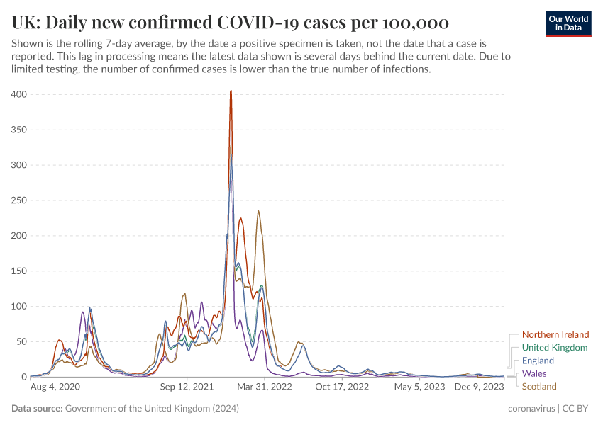 Government of the United Kingdom (2024) – with minor processing by Our World in Data. “UK: Daily new confirmed COVID-19 cases per 100,000” [dataset]. Government of the United Kingdom, “UKHSA data dashboard” [original data]. Retrieved June 26, 2025 from https://remove-datapage-tags.owid.pages.dev/grapher/uk-daily-covid-cases-7day-average