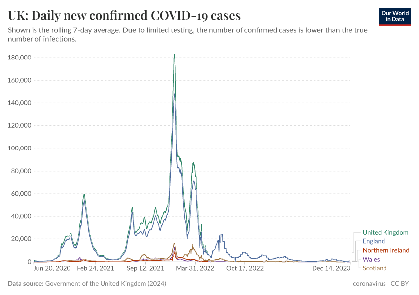 Government of the United Kingdom (2024) – with minor processing by Our World in Data. “UK: Daily new confirmed COVID-19 cases” [dataset]. Government of the United Kingdom, “UKHSA data dashboard” [original data]. Retrieved June 26, 2025 from https://remove-datapage-tags.owid.pages.dev/grapher/uk-daily-new-covid-cases