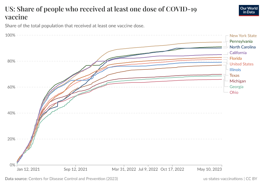 Centers for Disease Control and Prevention (2023) – processed by Our World in Data. “US: Share of people who received at least one dose of COVID-19 vaccine” [dataset]. Centers for Disease Control and Prevention, “COVID-19, Vaccinations (United States)” [original data]. Retrieved June 26, 2025 from https://remove-datapage-tags.owid.pages.dev/grapher/us-covid-19-share-people-vaccinated
