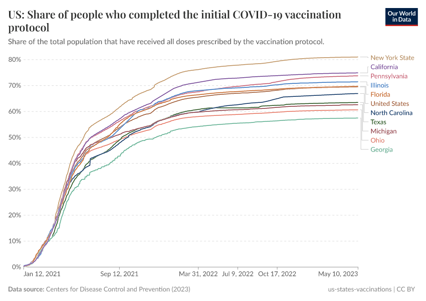 Centers for Disease Control and Prevention (2023) – processed by Our World in Data. “US: Share of people who completed the initial COVID-19 vaccination protocol” [dataset]. Centers for Disease Control and Prevention, “COVID-19, Vaccinations (United States)” [original data]. Retrieved June 26, 2025 from https://remove-datapage-tags.owid.pages.dev/grapher/us-covid-share-fully-vaccinated