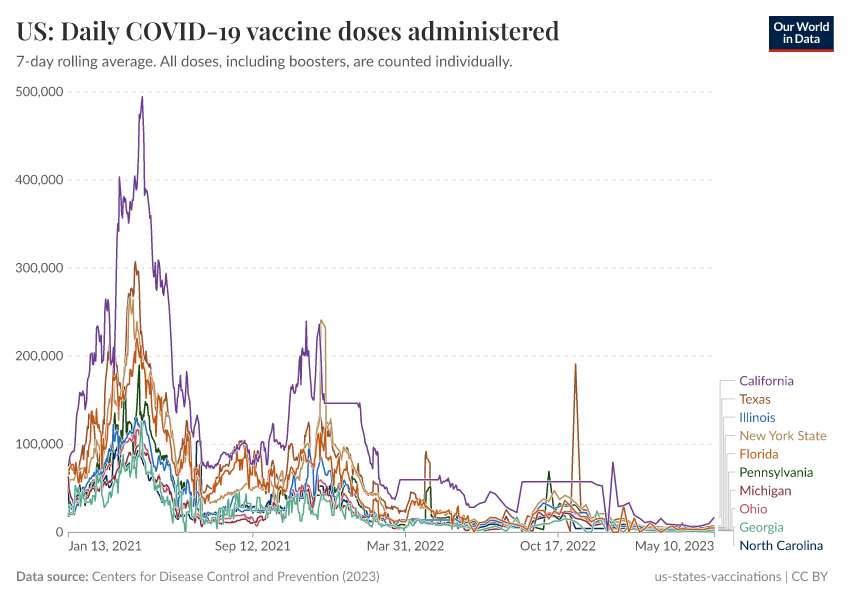 Centers for Disease Control and Prevention (2023) – processed by Our World in Data. “US: Daily COVID-19 vaccine doses administered” [dataset]. Centers for Disease Control and Prevention, “COVID-19, Vaccinations (United States)” [original data]. Retrieved June 26, 2025 from https://remove-datapage-tags.owid.pages.dev/grapher/us-daily-covid-vaccine-doses-administered