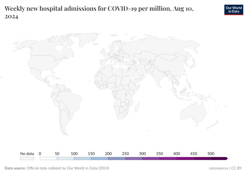 “Data Page: Weekly new hospital admissions for COVID-19 per million”, part of the following publication: Edouard Mathieu, Hannah Ritchie, Lucas Rodés-Guirao, Cameron Appel, Daniel Gavrilov, Charlie Giattino, Joe Hasell, Bobbie Macdonald, Saloni Dattani, Diana Beltekian, Esteban Ortiz-Ospina, and Max Roser (2020) - “COVID-19 Pandemic”. Data adapted from Official data collated by Our World in Data. Retrieved from https://remove-datapage-tags.owid.pages.dev/grapher/weekly-hospital-admissions-covid-per-million [online resource]