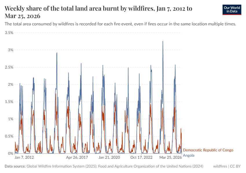Global Wildfire Information System (2025); Global Wildfire Information System (2024); Food and Agriculture Organization of the United Nations (2024) – with minor processing by Our World in Data. “Weekly share of the total land area burnt by wildfires” [dataset]. Global Wildfire Information System, “Seasonal wildfire trends”; Food and Agriculture Organization of the United Nations, “Land, Inputs and Sustainability: Land Use” [original data]. Retrieved June 26, 2025 from https://remove-datapage-tags.owid.pages.dev/grapher/weekly-share-of-the-total-land-area-burnt-by-wildfires