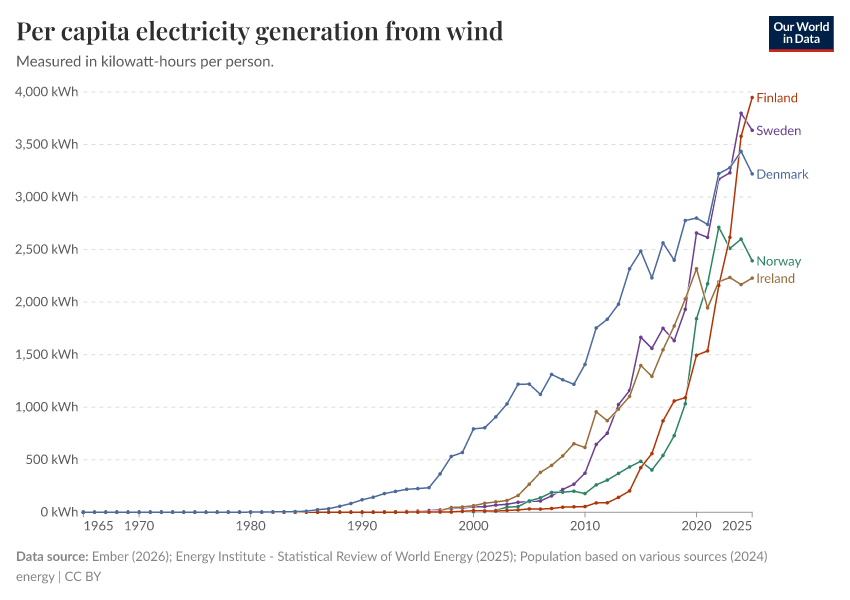 Ember (2025); Energy Institute - Statistical Review of World Energy (2024); Population based on various sources (2024) – with major processing by Our World in Data. “Electricity generation from wind power per person” [dataset]. Ember, “Yearly Electricity Data Europe”; Ember, “Yearly Electricity Data”; Energy Institute, “Statistical Review of World Energy”; Various sources, “Population” [original data]. Retrieved June 26, 2025 from https://remove-datapage-tags.owid.pages.dev/grapher/wind-electricity-per-capita