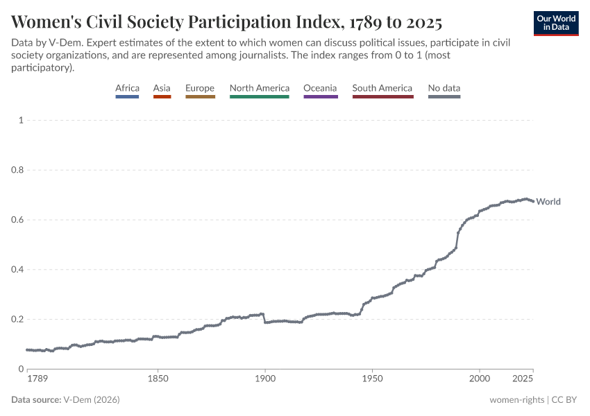 “Data Page: Women's civil society participation index”, part of the following publication: Bastian Herre, Lucas Rodés-Guirao, and Esteban Ortiz-Ospina (2013) - “Democracy”. Data adapted from V-Dem. Retrieved from https://remove-datapage-tags.owid.pages.dev/grapher/women-civil-society-participation-index [online resource]How to cite this data