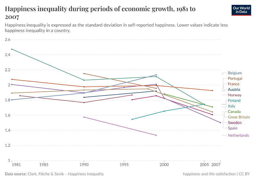 The results from Stevenson and Wolfers are consistent with other studies looking at changes of happiness inequality (or life satisfaction inequality) over time. In particular, researchers have noted that there is a correlation between economic growth and reductions in happiness inequality—even when income inequality is increasing at the same time. The visualization here uses data from Clark, Fleche, and Senik (2015)6 shows this. It plots the evolution of happiness inequality within a selection of rich countries that experienced uninterrupted GDP growth.
