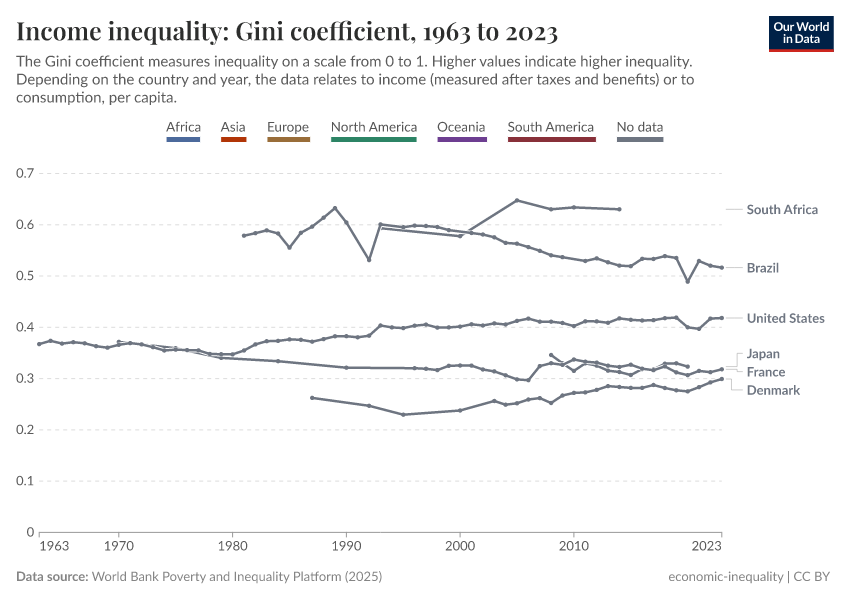 The range of incomes considered ‘middle’ and ‘high’ income countries according to the World Bank are very low relative to rich countries. High-income economies are those with a GNI per capita of $12,536 or more. The range of middle-income economies begins at a GNI per capita of $1,036. In this post I want to rely on countries like Denmark; higher income countries by any standard.