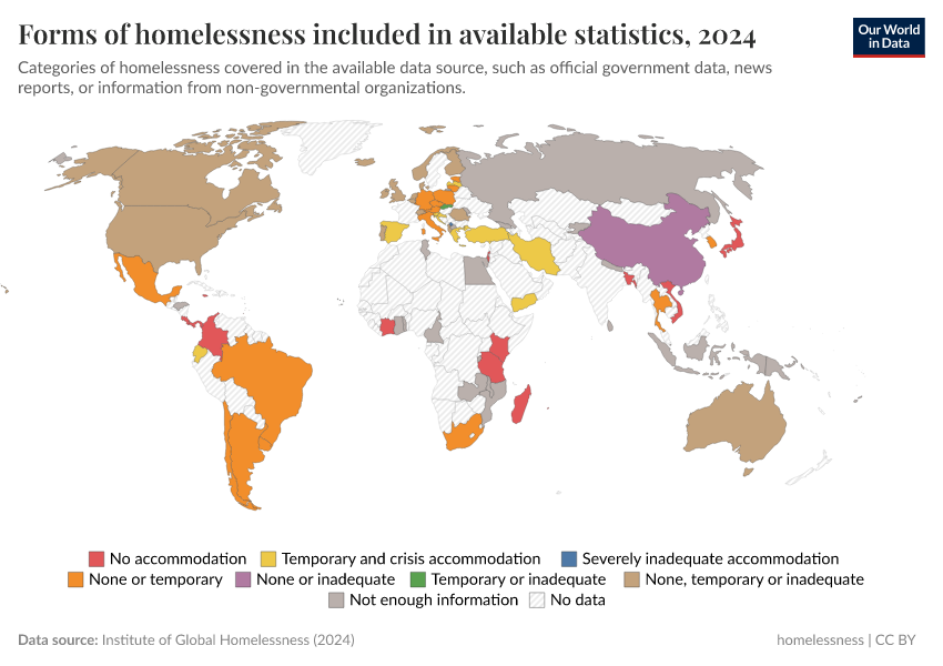 The map shows the forms of homelessness included in country statistics, as recorded by the Institute of Global Homelessness.