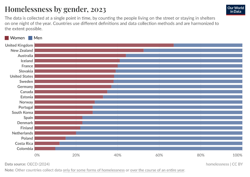 In the United Kingdom and New Zealand, it’s even the opposite: more women experience homelessness than men.