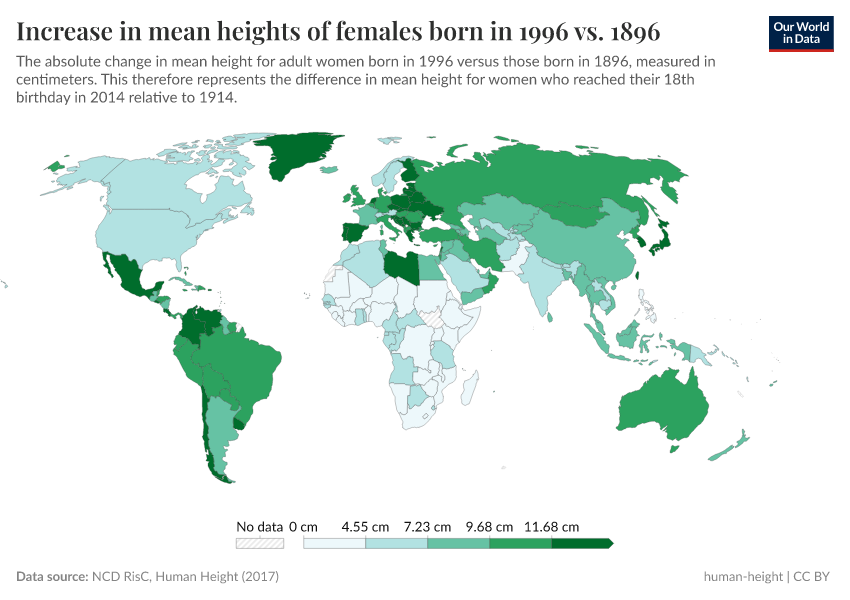 People today are taller, on average, than their ancestors were 100 years ago. This is true for every country in the world.