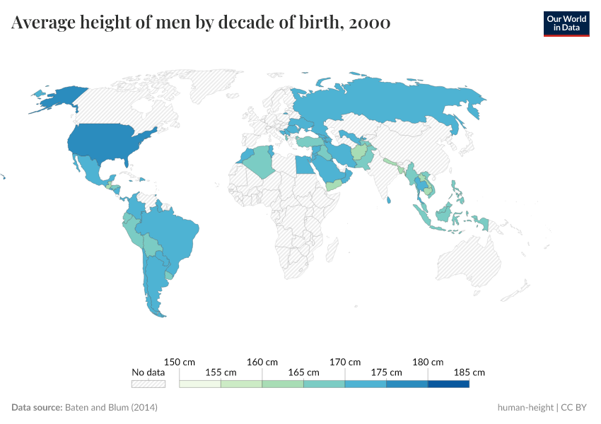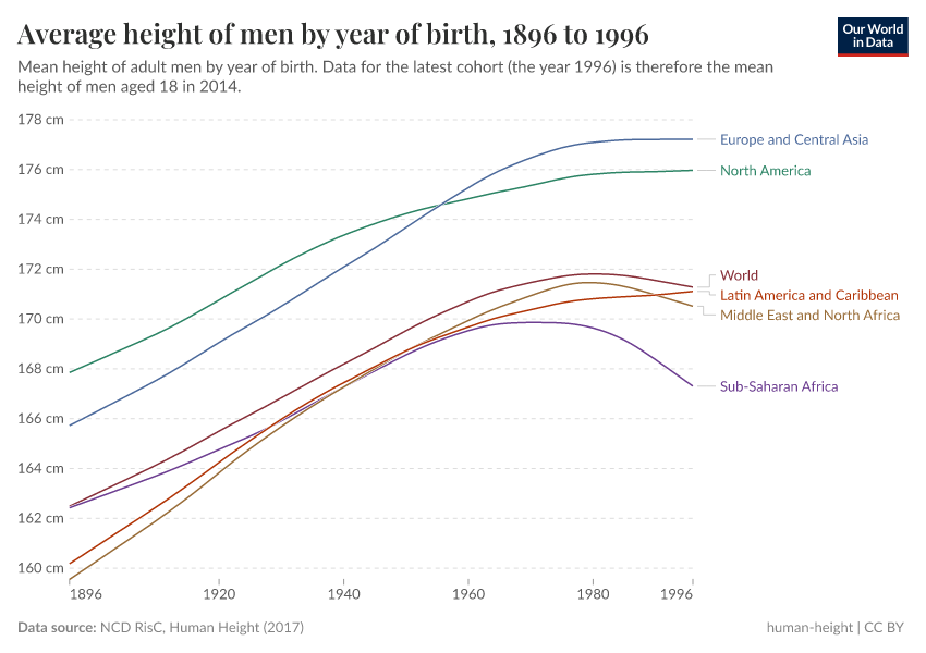 The data shown here comes from a global study, published by the NCD Risk Factor Collaboration (NCD-RisC) in 2016.4 This dataset is based on both demographic and health surveys as well as academic studies. It reports the estimated average (mean) height for adults by their year of birth, meaning that it only includes estimates for those who have reached the age of 18.