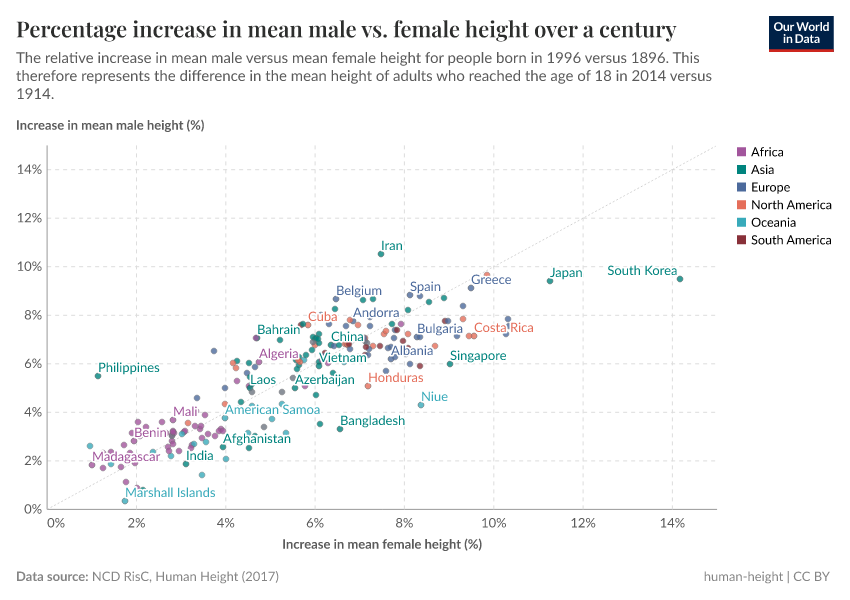 This chart shows the percentage change in men on the y-axis, and for women on the x-axis. The grey line here represents where the change was equal for both sexes. Countries that lie above the grey line saw greater height increases in men than in women; for countries below the line, the opposite is true.