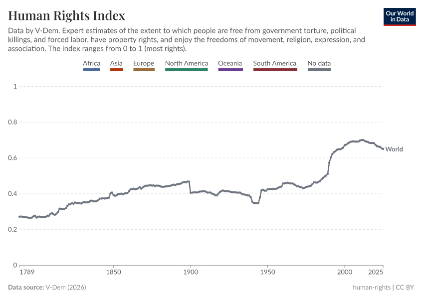 On this page, you can find data, visualizations, and writing on how the protection of human rights has changed over time, how it differs across countries, and how it varies between people of different genders, sexualities, and ethnicities.