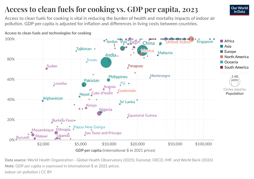 Low-income households tend to rely on solid fuels for cooking because cleaner fuels are either unavailable or too expensive. We, therefore, see a strong link between death rates from indoor air pollution and access to clean fuels for cooking.