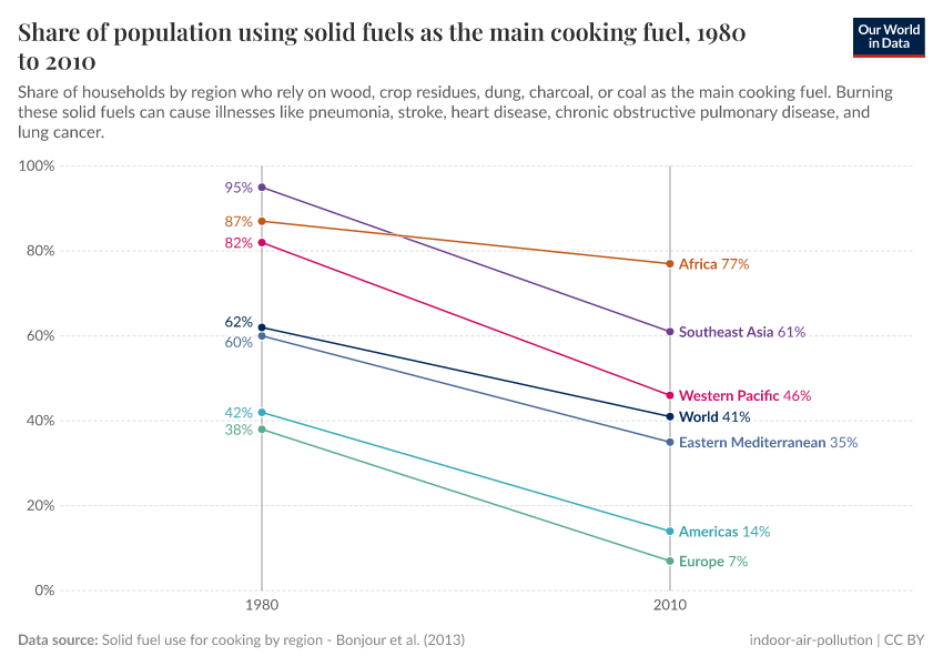 The chart shows that the world is making progress in this direction. In 1980, almost two-thirds of the world’s population used solid fuels for their cooking. Thirty years later, this is down to around 40%. The chart also shows that it is a problem associated with poverty: In richer Europe and North America, the share is much lower than in the rest of the world, and in the high-income countries of the world, the use of solid fuels is entirely a thing of the past.