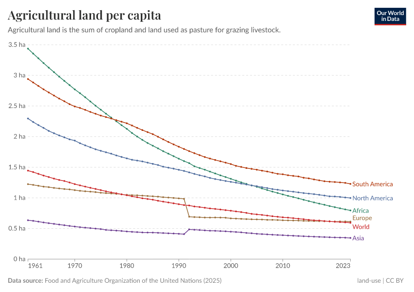 Africa, in particular, has seen dramatic reductions in agricultural land per person – it is now less than one-third of the value it was in the 1960s. The Americas (North and South) and Africa have notably higher per capita agricultural land use relative to Europe and Asia.