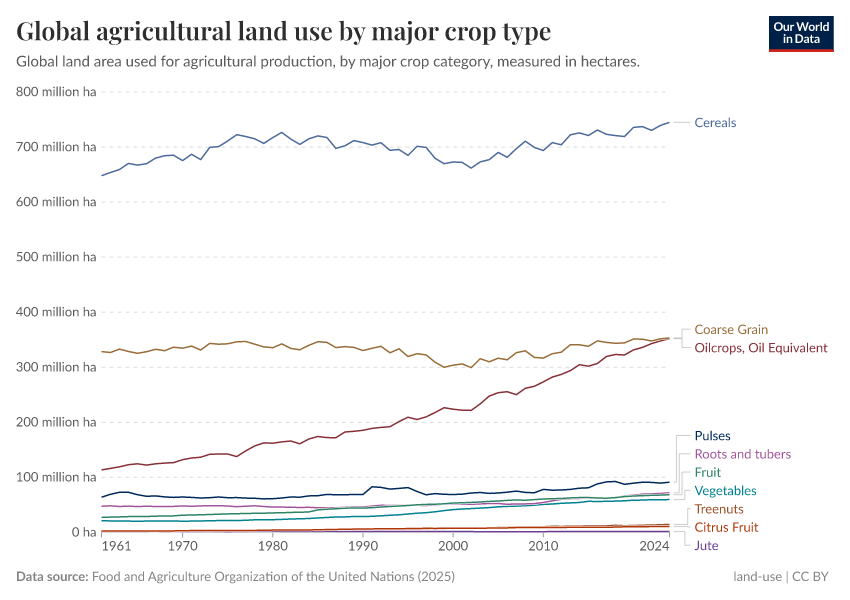 In the chart here, we see the global area of land use in agriculture by major crop types from 1961 onwards. Overall, we see that the majority of our arable land is used for cereal production; this has grown by around 70 million hectares — an area roughly twice the size of Germany. The total land area used for coarse grains has remained approximately constant since 1961 and is the second largest user of arable land.