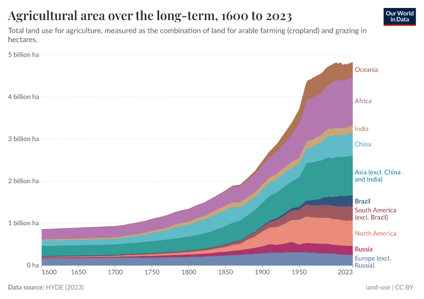 This visualization shows the total land used for agriculture (which is a combination of cropland and grazing land) over the long term, measured in hectares. In the following sections, you can find disaggregated data on cropland and grazing land change over time.