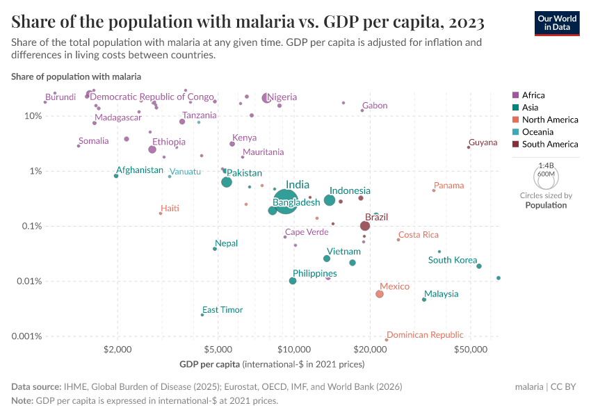 In the chart below, you can see each country’s prevalence of malaria compared to their GDP per capita.