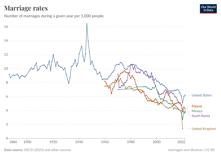 The chart also shows that in comparison to other rich countries, the US has had particularly high historical marriage rates. But in recent decades, marriage rates have decreased in almost all countries.