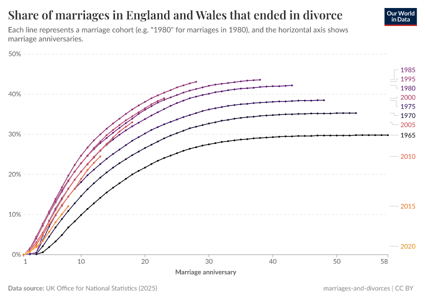 We see both of these factors in data on divorce rates from England and Wales. The chart maps out the percentage of marriages ending in divorce by cohort: each line represents the year the couple got married (those married in 1965, in 1970, etc.), and the horizontal axis is the number of years since the wedding.