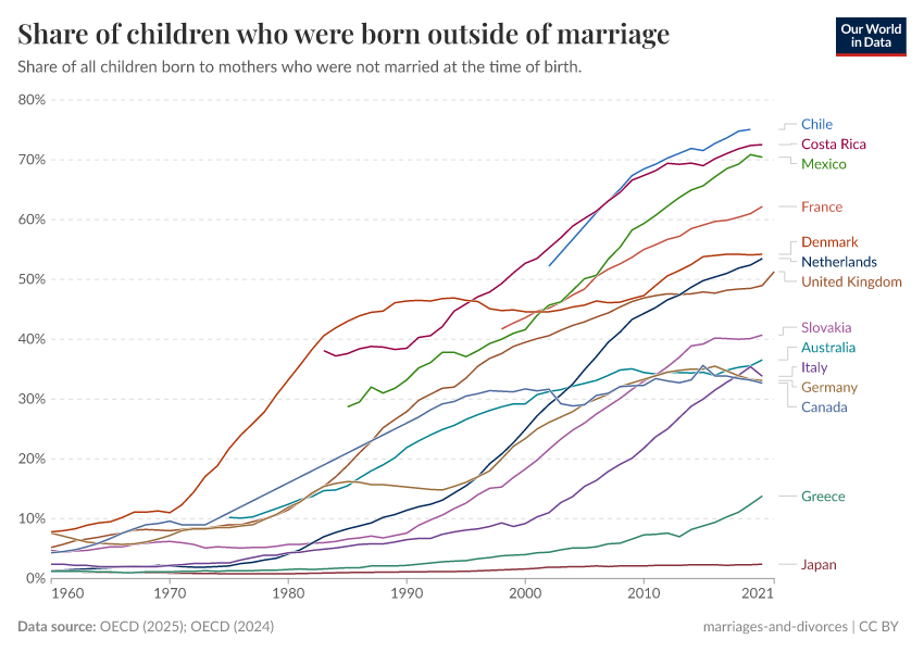 In 1970, less than 10% of children were born outside of marriage in most OECD countries. In 2020, this share had increased to more than 30% in most countries and to more than half in some.