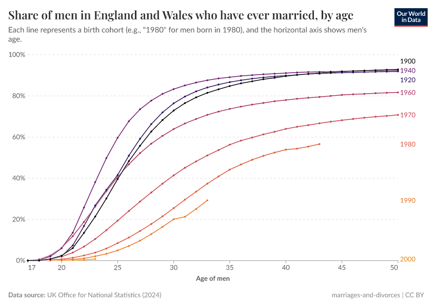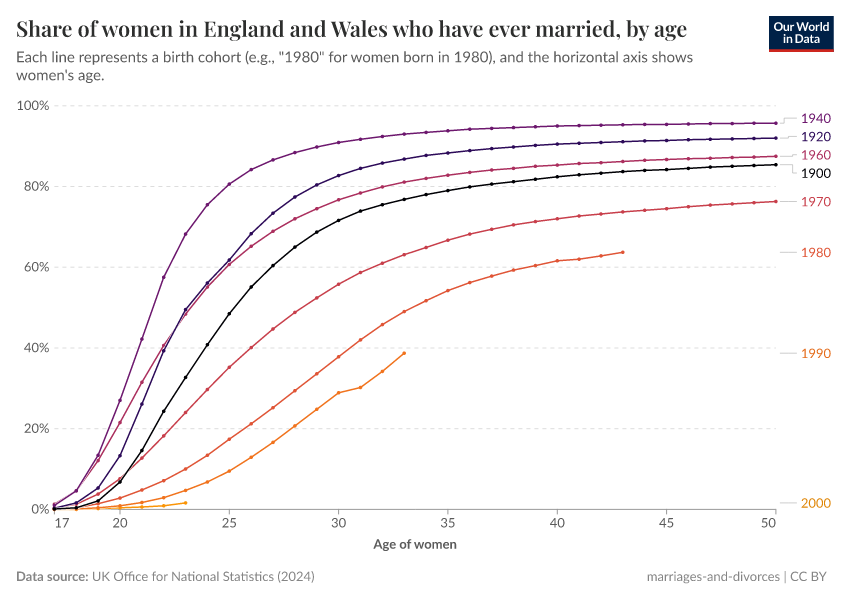 Some countries have statistical records going back several generations, which allow us to estimate marriage rates by age and year of birth. The charts here show this data for women and men born in England and Wales as early as 1900.