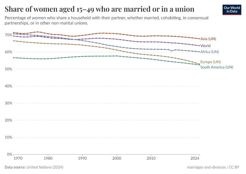 There are differences between regions: the share of women married or in a union has changed less in Asia and South America, and more in Africa, Europe, and North America.