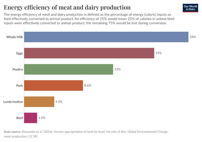 Protein and energy efficiency are calculated as the quantity of protein/energy in animal feed which is effectively converted into protein/energy in the resultant animal products. For example, if we feed a chicken 500 grams of protein and only get 100 grams out in chicken meat, we define this protein conversion efficiency as 20 percent (calculated as output (100 grams) / input (500 grams)). The same calculation process applies to energy conversion efficiency using caloric inputs and outputs.