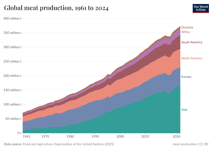Meat is an important source of nutrition for many people around the world. Global demand for meat is growing: over the past 50 years, meat production has more than tripled. The world now produces more than 350 million tonnes each year.