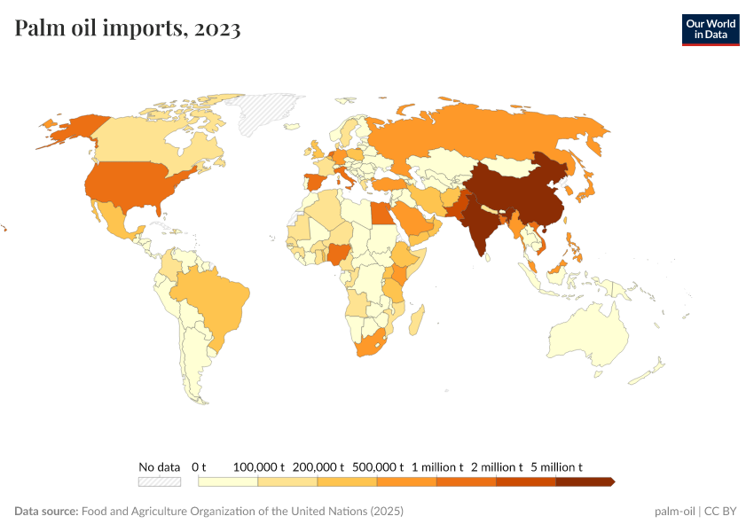 In the next section, we will look at what countries produce palm oil, but here, we see a map of palm oil imports. Although production is focused in only a few countries across the tropical belt, we see that palm oil is an important product across the world.