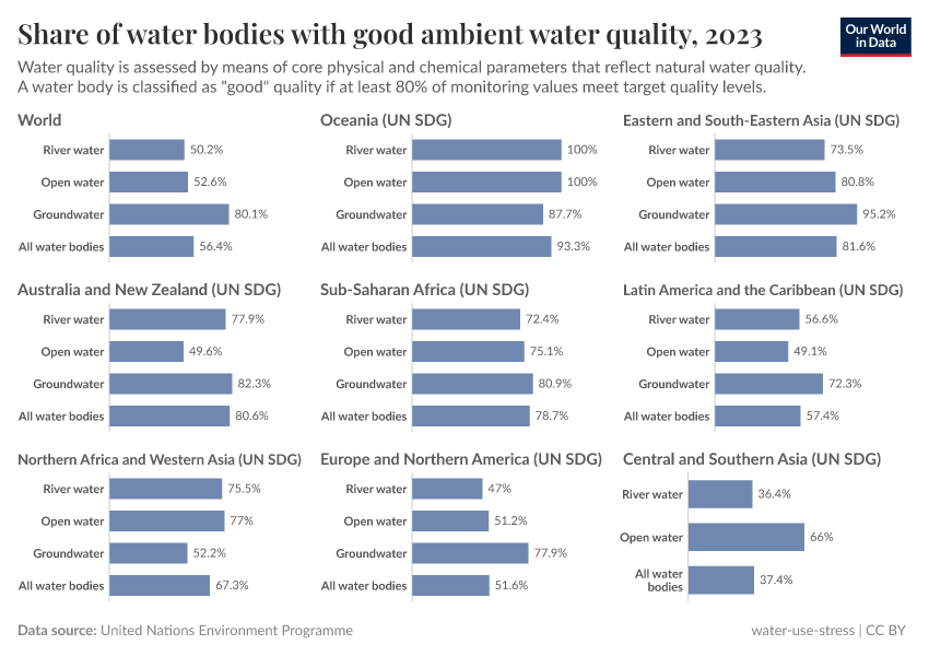 This indicator measures the share of river, lake, and groundwater bodies in a country that have good ambient water quality, out of those that are deemed representative and significant for water quality monitoring.