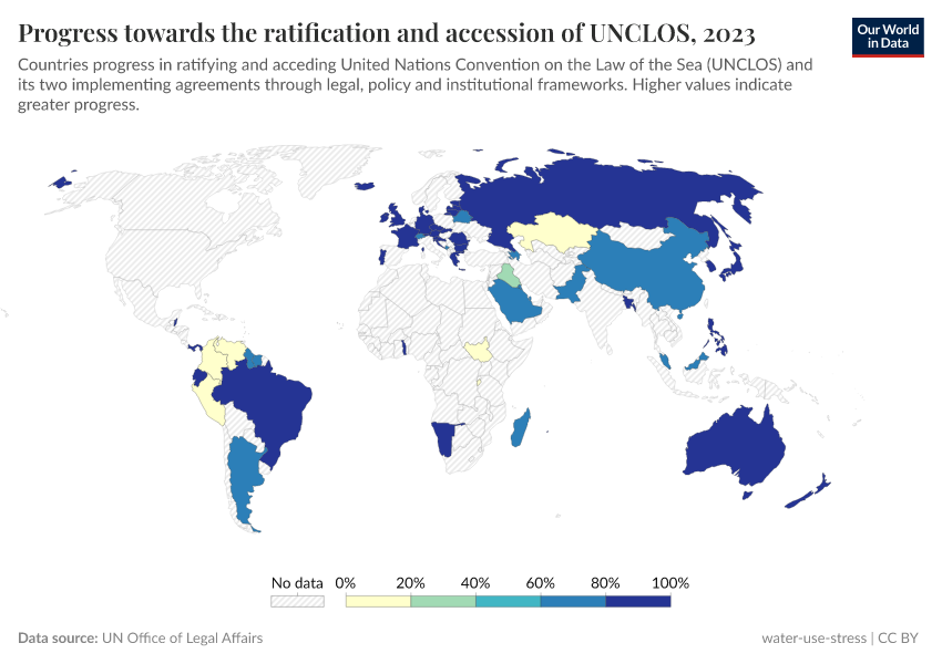 This indicator is measured as the progress countries have made towards the ratification and accession, as well as implementation of the United Nations Convention on the Law of the Sea (UNCLOS). Note that the visualization only shows data for countries that replied to the questionnaire on the ratification, accession and implementation of UNCLOS.