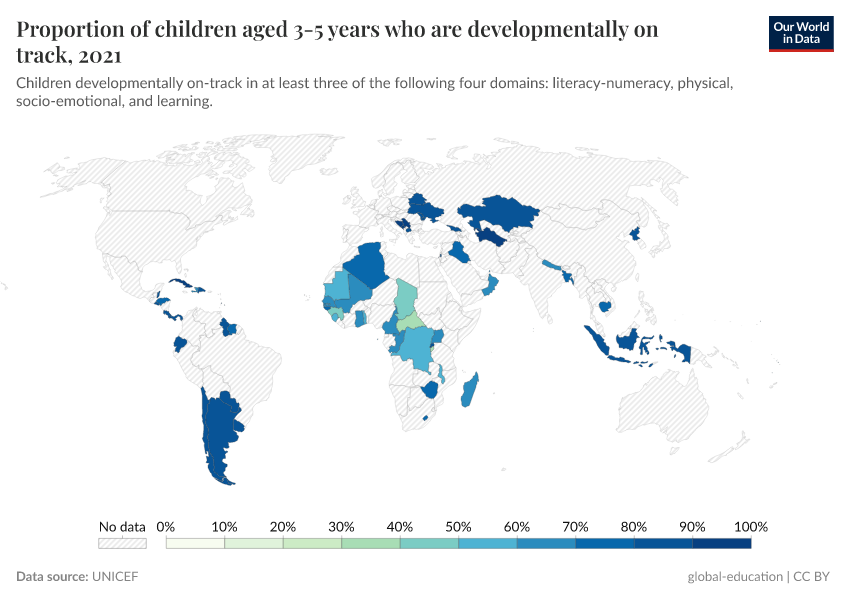 Since internationally comparable data for this indicator is not currently available, this is measured by the United Nations through a proxy indicator defined as the proportion of children aged 36-59 months in each country who are developmentally on-track in at least three of the following four domains: literacy-numeracy, physical, socio-emotional and learning.