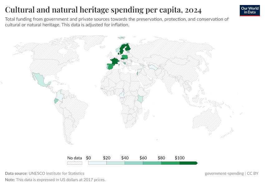 Data for this indicator is shown in the interactive visualization. It is given as per capita expenditure – from public and private sources – on cultural and natural heritage preservation, protection, and conservation. This data is reported in constant dollars, which adjusts for inflation.