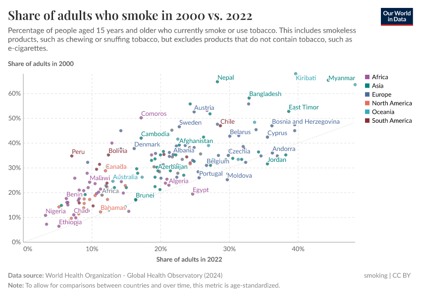 In this visualization, we see the share of adults who smoked in the year 2000 (on the y-axis) and in the most recent data (on the x-axis). The grey line here shows parity: countries that lie along this line would have the same smoking prevalence at both points in time. Countries that lie above this line had higher smoking prevalence back in 2000; for those below the opposite is true.