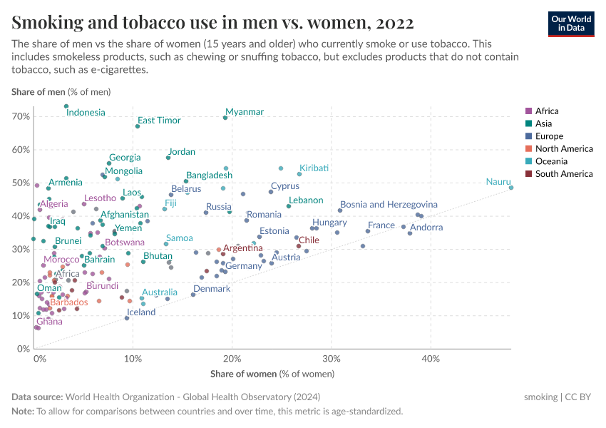 In almost all countries, it is true that a large share of men smoke. In the visualization, we see the share of men who smoke (plotted on the vertical axis) compared with the same metric for women (plotted on the horizontal axis).