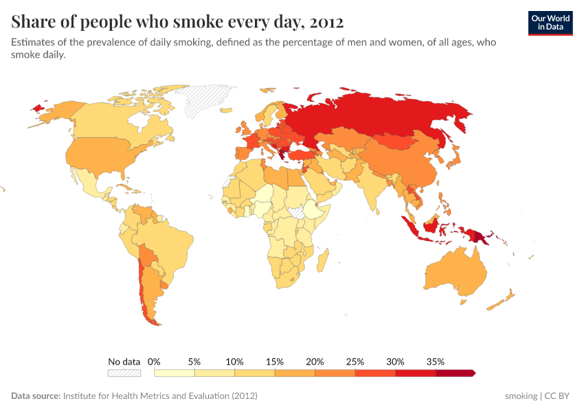 Related – number of daily smokers. This map shows the number of people who smoke every day across the world.