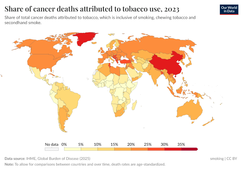 The world map shows the Global Burden of Disease estimates of the share of cancer deaths that can be attributed to smoking.