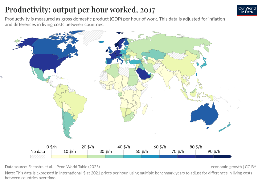 As our interactive chart shows, this historical achievement is underpinned by productivity growth: in many countries, workers produce much higher output per hour today than in 1950.