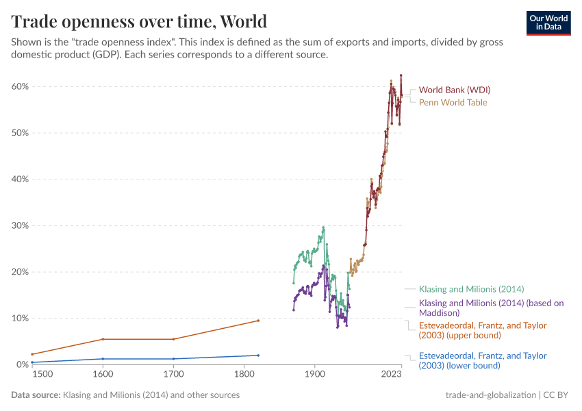 Esteban Ortiz-Ospina, Diana Beltekian, and Max Roser (2018) - “Trade and Globalization” Published online at OurWorldinData.org. Retrieved from: 'https://remove-datapage-tags.owid.pages.dev/trade-and-globalization' [Online Resource]BibTeX citation