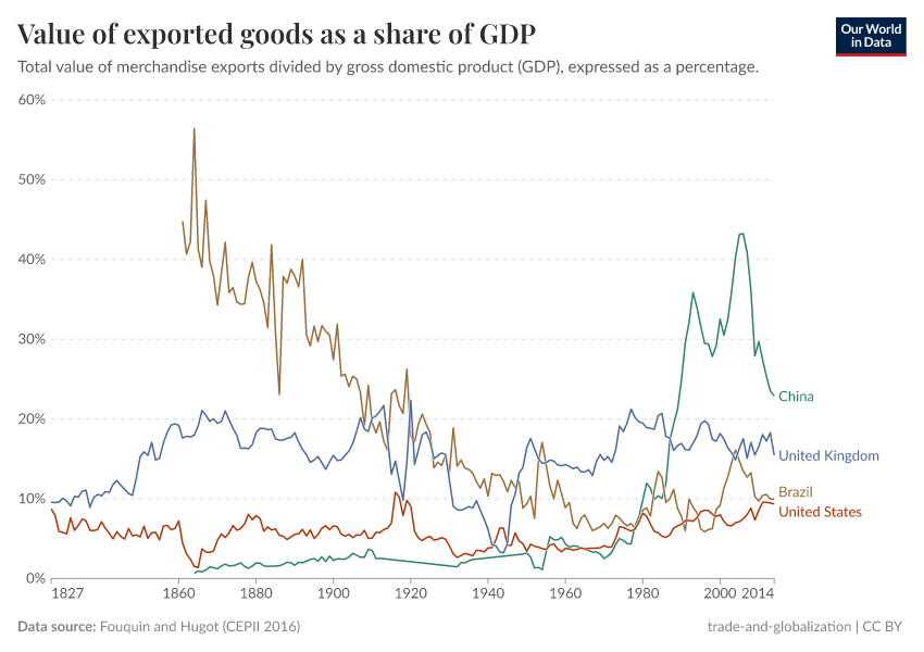 The chart shows an extraordinary growth in international trade over the last couple of centuries: Exports today are more than 40 times larger than in 1913.