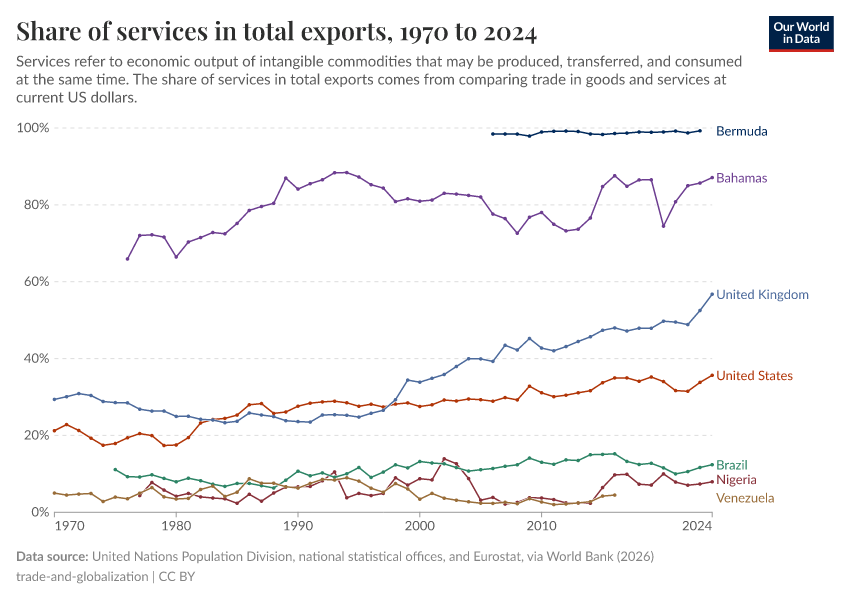 In some countries services are today an important driver of trade: in the UK services account for around half of all exports; and in the Bahamas, almost all exports are services.