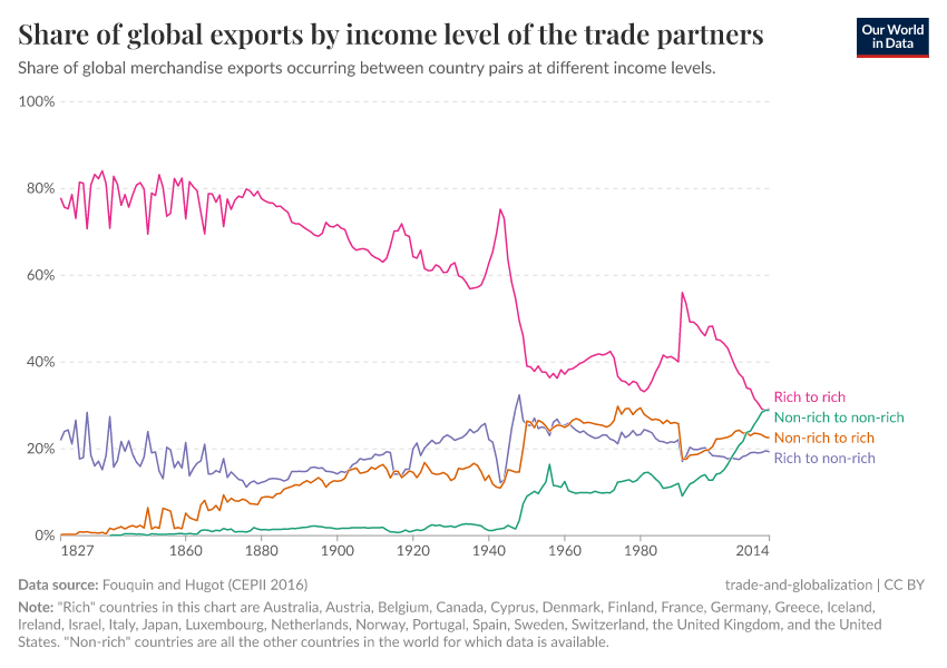 As we can see, up until the Second World War, the majority of trade transactions involved exchanges between this small group of rich countries. But this has changed quickly over the last couple of decades, and today, trade between non-rich countries is just as important as trade between rich countries.