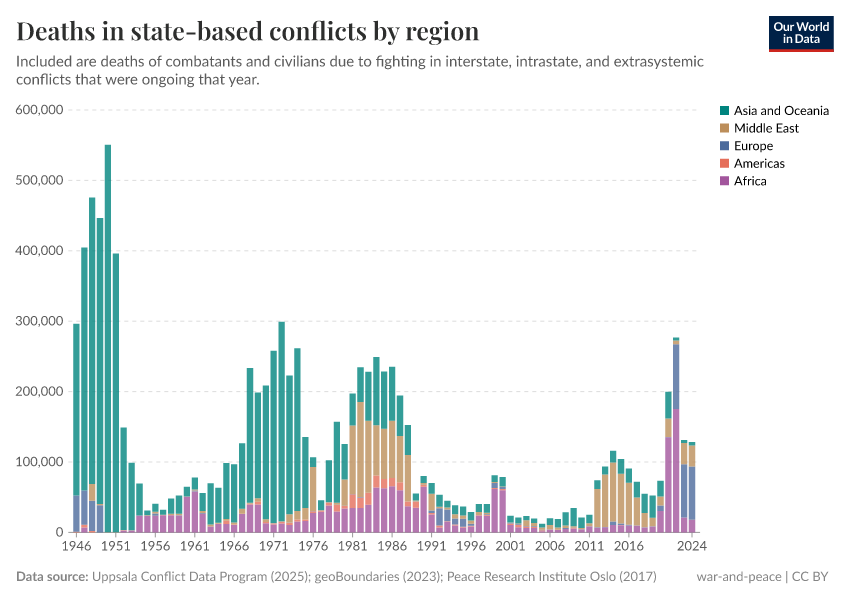 Bastian Herre, Lucas Rodés-Guirao, and Max Roser (2024) - “War and Peace” Published online at OurWorldinData.org. Retrieved from: 'https://remove-datapage-tags.owid.pages.dev/war-and-peace' [Online Resource]BibTeX citation