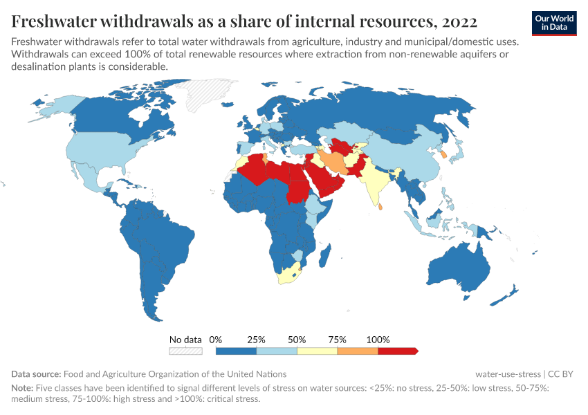The visualization provides a measure of levels of water stress across the world. This is measured based on freshwater withdrawals as a share of internal (renewable) resources. The Food and Agriculture Organization of the United Nations categorizes water stress in the following ways: if withdrawals are less than 25 percent of resources, then a country has no water stress; 25-50 percent is low stress; 50-75 percent is medium; 75-100 percent high stress; and greater than 100 percent is critical stress.3