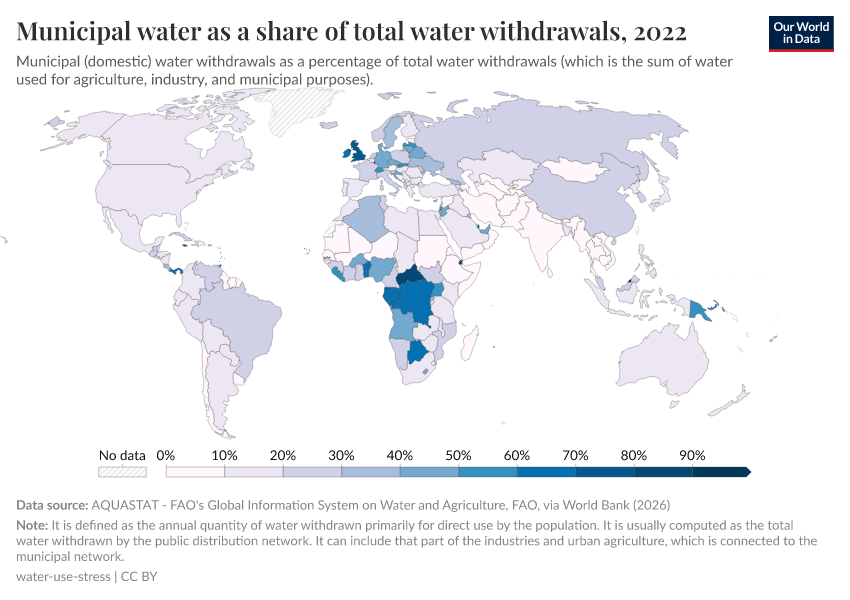 Municipal uses as a share of total water withdrawals across the world are shown in the chart. The majority of countries use less than 30 percent of withdrawals for domestic purposes.